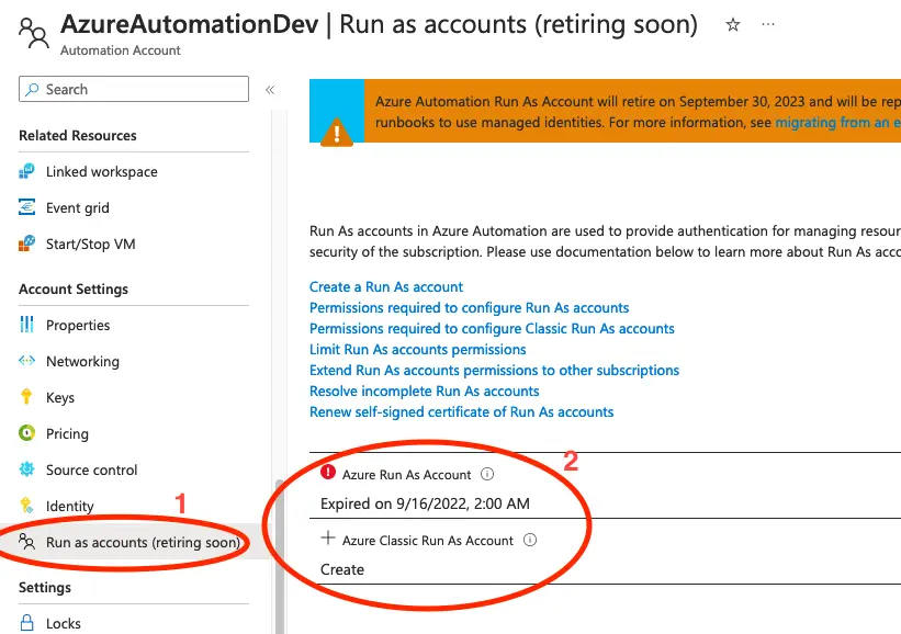 In the screenshot above we can see that there has been created an Azure Run As Account, so perhaps this has been in use at some point. However, the account expired last year, so if you have not experienced any issues lately, you are likely not using this account.